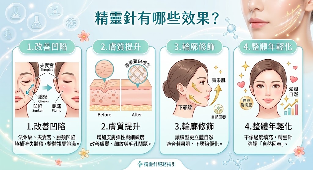 精靈針是一種結合填充與膠原蛋白刺激的注射型療程,通常含有可被人體吸收的成分,能在填補凹陷的同時促進自體膠原蛋白生成。