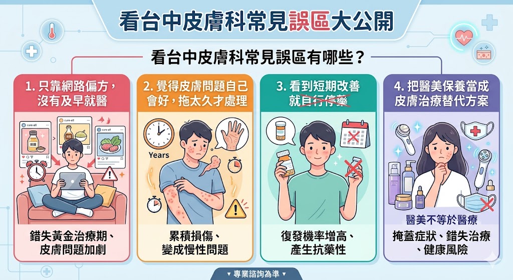 最常見的誤區,就是只靠網路偏方或一直自己買藥擦。第二個是覺得皮膚問題會自己好,所以拖很久才處理。第三個則是看到短期改善就自己停藥,結果很快又復發